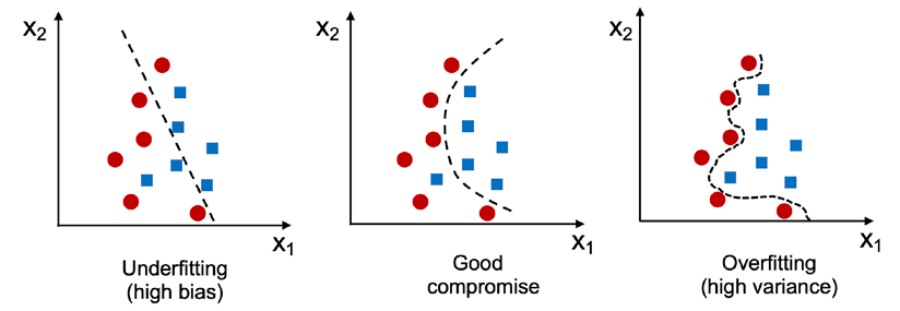 If you look at the figure, you can see the model exhibits underfitting, where it fails to adequately capture the patterns in the training data, leading to poor learning performance, making predictions on unseen data practically impossible. On the other hand, if the model becomes too closely fitted to the training dataset, that is, if overfitting occurs, it can be seen as the model learning information specific to the training dataset rather than generalizing the data's strucutre or pattern.