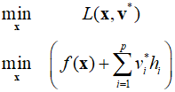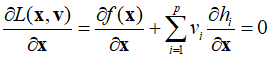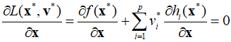 ${\bf{v}}$ is the $p$-dimensional vector of Lagrange multipliers for the equality constraints. If ${x^*}$ is a local minimum and a regular point of the feasible set, there exists a unique Lagrange multiplier $v_i^*$ for each constraint, satisfying the first-order necessary conditions.