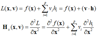To consider the local duality theory, take an example of problem with equality constraints. Assume that the function $f$ and ${h_i}$ are twice differentiable. ${h_i}(x)=0$ represents the equality constraint. The Lagrangian function and its Hessian are as follows.