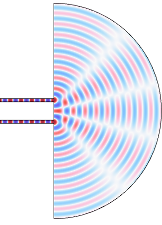Today, I'll simulate the interference between two slits composed of waves or sound using COMSOL. I'll generate plane waves using two thin wavelengths leading to the slits on the screen and calculate the pattern on the opposite side. For detailed information, please refer to the COMSOL Application Library.