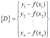 Where $n$ represent the number of data points, and $\partial {f_i}/\partial {a_k}$ is the partial derivative of the function with respect to the $k$th parameter at the $i$th data point. The vector $D$ denotes the difference between the measured values and the function values.