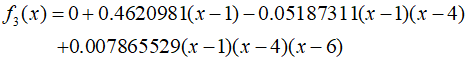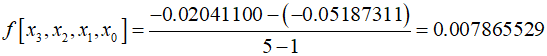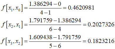 This is called Newton's divided-difference interpolating polynomial. The data points do not need to be equidistant, and the $x$-values of the points do not need to be in ascending order. In other words, higher-order differences are calculated by taking the difference of lower-order differences. Let's solve an example estimating the value of $\ln 2$ using this method. In the previous example, three data points were used for estimation. This time, by adding ${x_3} = 5$, I'll use Newton's third-degree interpolating polynomial to estimate the value.