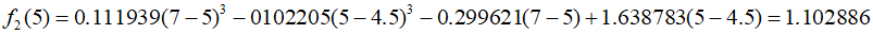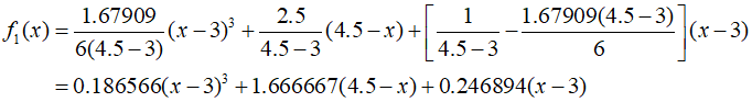 This equation is the cubic spline for the first interval. Similarly, by substituting appropriate values, the equations for the second and third intervals can be calculated.