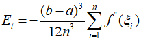 Here, ${{f^{''}}({\xi _i})}$ represents the second derivative at point ${{\xi _i}}$ within segment $i$. This result can be simplified by estimating the average value of the second derivative over the entire interval, or by using the mean value.