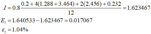 This example demenstrates that the multiple application version of Simpson's $1/3$ rule provides very accurate estimates. For this reason, it is oftern preferred over the trapezoidal rule in most fields due to its superior accuracy and is more widely used. However, as previously mentioned, it can only be applied when the values are equidistant, and it requires an even number of segments and an odd number of points, which are limitations.
