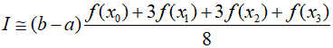Here $h$ is equal to $(b-a)/3$, and since $h$ is multiplied by $3/8$, this equation is referred to as Simpson's $3/8$ rule. This is also the third Newton-Cotes closed integration formula. It can be expressed as follows.