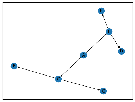 G.add_edges_from([('A','B'),('A','C'),('B','D'),('B','E'),('C','F'),('C','G')])