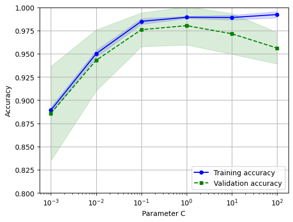 Similar to the learning curve function, the 'validation_curve' function by default uses stratified $k$-fold cross-validation to estimate the classifier's performance. In this case, we access the 'LogisticRegression' object within the pipeline through the inverse regularization parameter of the logistic regression classifier specified over a range of values using the 'param_range' parameter. Similar to the previous code, we plot the mean training and cross-validation accuracy along with the respective standard deviations.
