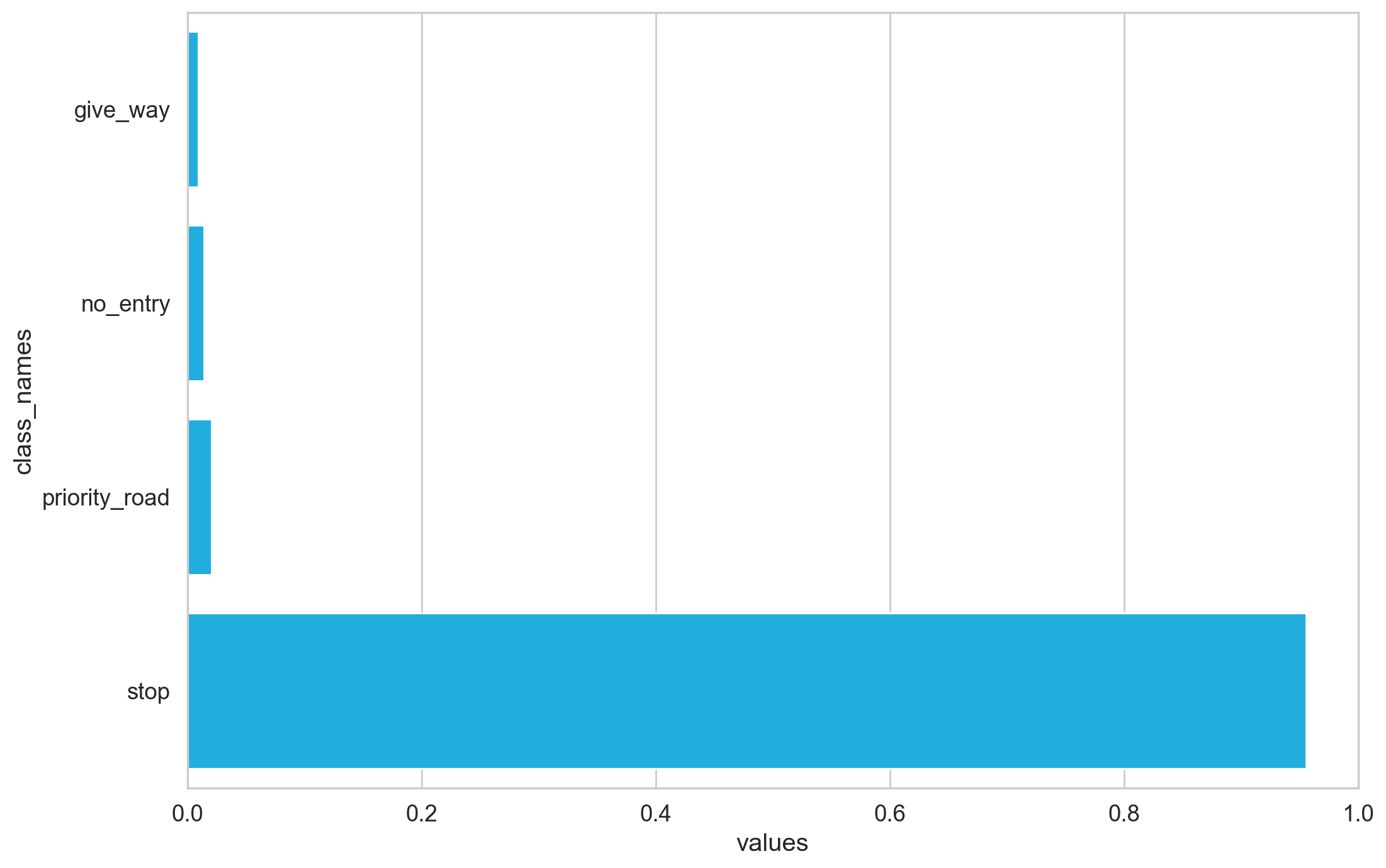 sns.barplot(x='values', y='class_names', data=pred_df, orient='h')