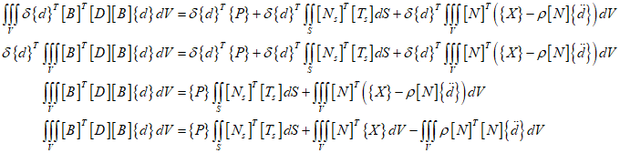 where $\delta \left\{ d \right\}$ is the vector of virtual nodal displacements, $\delta \left\{ \psi \right\}$ is the vector of virtual displacement functions $\delta u$, $\delta v$, and $\delta w$, $\delta \left\{ {{\psi _s}} \right\}$ is the vector of virtual displacement functions acting over the surface where surface tractions occur, $\left\{ P \right\}$ is the nodal force matrix, $\left\{ {{T_s}} \right\}$ is the surface force per unit area matrix, and $\left\{ X \right\}$ is the body force per unit volume matrix.