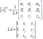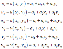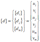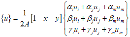 The basic triangle in the picture has nodes $i$, $j$, and $m$. Triangular elements are often used to approximate curved shapes. Each node has two degrees of freedom in $x$ and $y$, and the displacement matrix for the nodes is as follows.
