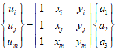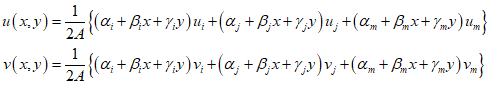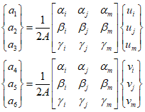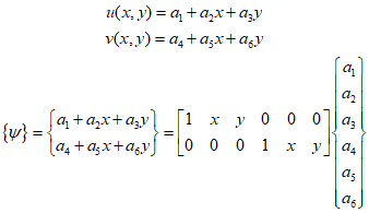The linear displacement function for each element can be represented as follows, and can also be expressed in matrix form.