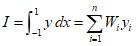 To approximate the definite integral, the function is evaluated at multiple sampling points($n$), and each value is multiplied by its corresponding weight ${W_i}$, then summed.