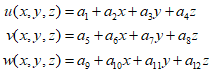 Furthermore, the displacement for $u$ can also be expressed as follows, and the same applies for $v$ and $w$.