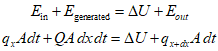 Where, ${E_{{\text{in}}}}$ is represents the energy entering the volume, $U$ is the change in stored energy, ${q_x}$ is the heat transferred into the volume, ${q_x}+{d_x}$ is the heat exiting the volume at surface $x+{d_x}$, $t$ is time, $Q$ is the internal heat source, denoting the amount of heat generated per unit volume, and $A$ is the cross-sectional area perpendicular to the heat flux $q$.