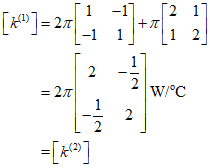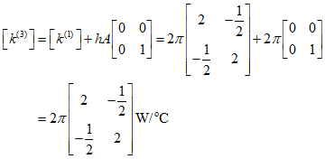 In the first element, the temperature is fixed at the left end, and the right end is inside the rod, not exposed to fluid movement, so there is no convection. Therefore, the convection term of the stiffness matrix is zero, and it can be represented by the above equation. On the other hand, the third element must consider the convection term due to heat loss at the right end, and it can be represented as follows.
