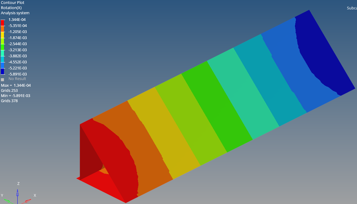 The maximum rotational displacement in the x direction is -5.891e-3 rad.