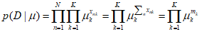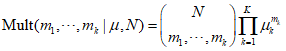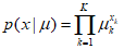 Here, $\mu = {\left( {{\mu _1}, \cdots ,{\mu _k}} \right)^T}$, and since it represents probabilies, it must satisfy conditions ${\mu _k} \geqslant 0$ and $\sum\nolimits_k {{\mu _k} = 1} $. The above formula can represent a generalization of the Bernoulli distribution for two or more outcomes.