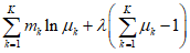 To fine the maximum likelihood solution for $\mu$, we need to maximize $\ln p(D|\mu )$ with respect to ${\mu _k}$, considering that the sum of all probabilities equals 1. For this, we use the Lagrange multiplier $\lambda $ to maximize as follows.