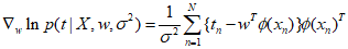 In the likelihood function, the maximum likelihood method can be used to determine $w$ and ${\sigma^2}$. To maximize with respect to $w$, we compute the gradient value with respect to $w$ in the above log likelihood function.