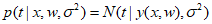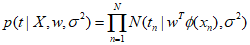 Assuming that the input data and target data are independently drawn as per the above equation, we can obtain a likelihood function for the adjustable parameters $w$ and ${\sigma^2}$.