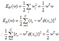 Where $\lambda $ is the regularization coefficient that adjust the ratio between the data-depentent error ${E_D}(w)$ and the regularization term ${E_W}(w)$. The individual terms and the overall error function are as follows.