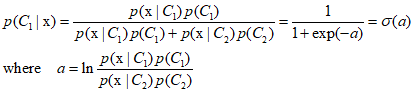 Starting, as before, with a problem involving two classes. The posterior probability of class ${C_1}$ is as follows. Here, the posterior probability represents calculating the probability of cause A after observing event B, essentially working backwards based on known information to find the answer. In this case, the likelihood function is also used.