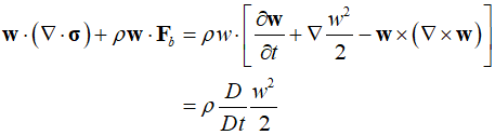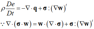 The rate of work done as a result of surface forces, denoted by ${\bf{w}} \cdot \left( {\nabla \cdot {\bf{\sigma }}} \right)$, describes the rate of displacement work. Aming these, the dot product term represents the rate of work related to static and viscous stresses. Thus, the internal energy equation is as follows.