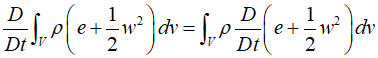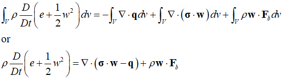 There are various forms of the energy equation, one of which is the total energy equation in its simplest form. Since the total energy per unit volume consists of internal energy, denoted as $\rho e$, and kinetic energy, denoted as $\rho {w^2}/2$, the rate of change of total energy in the material volume $V$ can be calculated as follows.