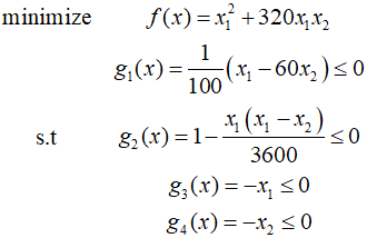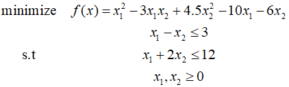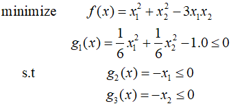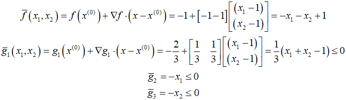 In this post, I'll solve an example using the the SQP algorithm described in the previous post. Starting point is $(1,1)$, ${R_0}=10$, $\gamma = 0.5$, and $\varepsilon = 0.001$. The initial iteration of the SQP algorithm is identical to the CSD algorithm. The result of the first iteration is as follows. At ${x^2}$, the gradients for the cost function and constraints are calculated as follows. Ca..